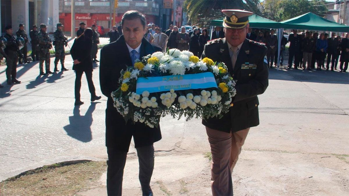 Durante el acto, el Vicegobernador, junto a representantes de las fuerzas de seguridad; legisladores provinciales y autoridades presentes, depositaron ofrendas florales al pie del busto del General Güemes.