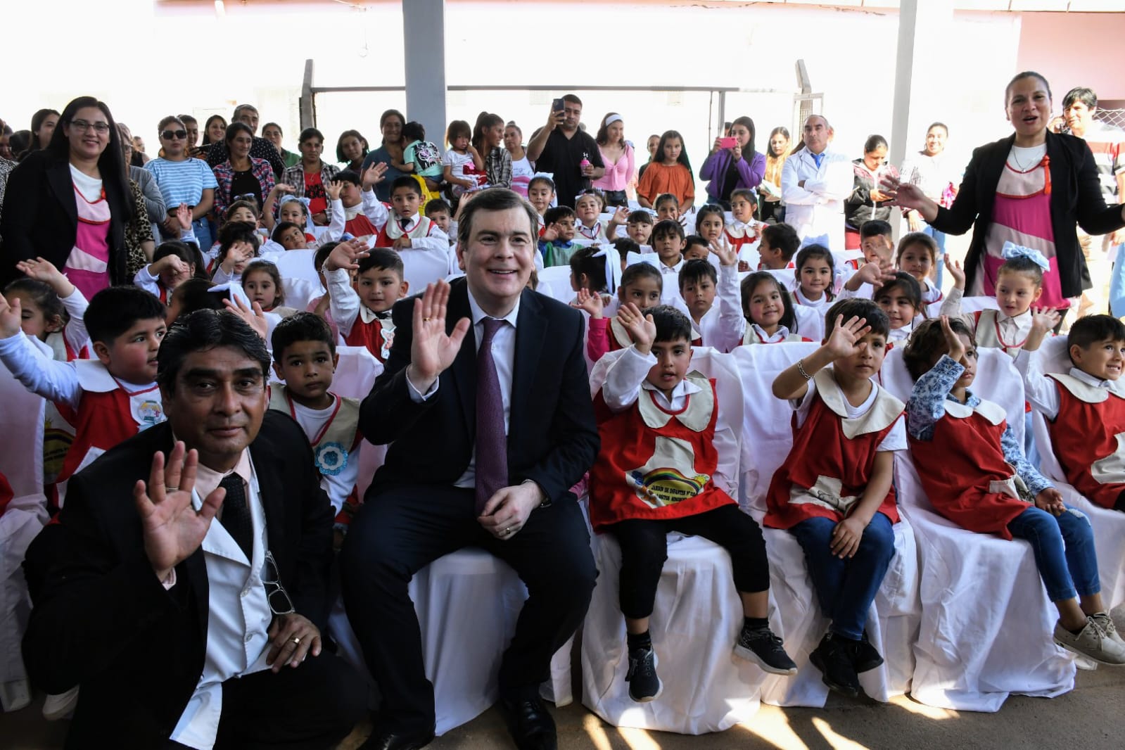 Tras el acto protocolar, el Gobernador pasó por la escuela primaria para saludar a todos los alumnos y docentes de la institución, con quienes compartió un agradable momento.