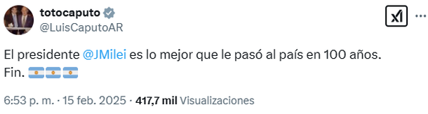 Algo similar hizo Patricia Bullrich, quien aseguró que «lo que está pasando o lo que pasó anoche con un tuit del presidente fue una bomba atómica para intentar bajarlo de un hondazo«, al mismo tiempo que calificó como «una cosa increíble» el hecho de «pedir juicio político por un tuit«.