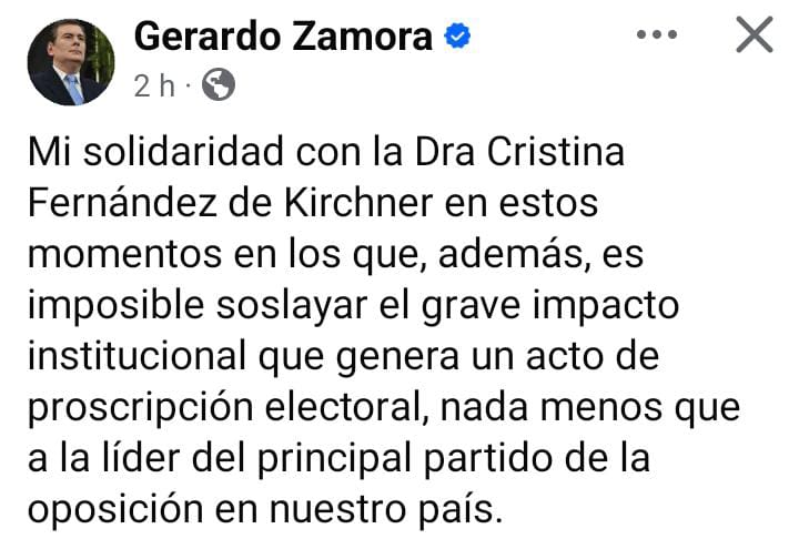De este modo, Zamora se sumó a numerosos gobernadores, dirigentes oficialistas y referentes políticos que cuestionaron duramente el fallo, señalando su impacto político y las posibles implicancias sobre el funcionamiento democrático. Según señalaron, la decisión judicial no solo afecta a la exmandataria, sino que también influye directamente en el escenario político y electoral del país.