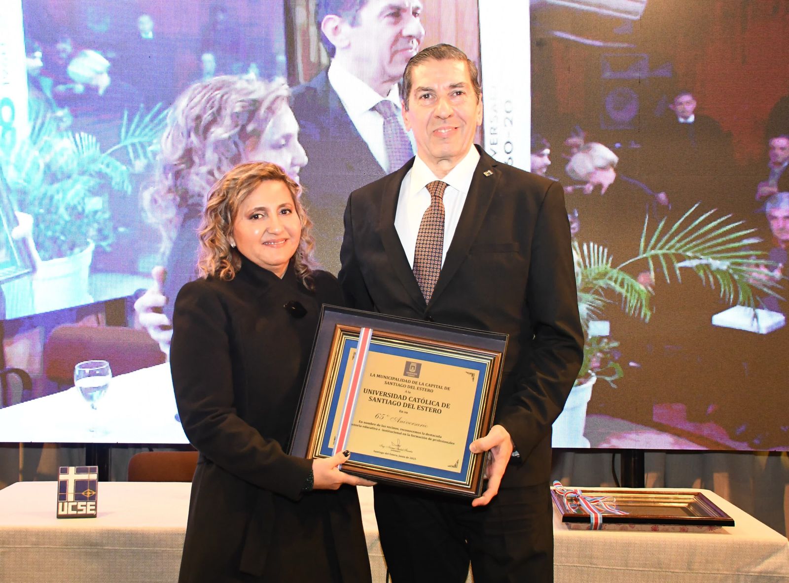 Durante la ceremonia, la jefa comunal hizo entrega en representación de la Municipalidad de la Capital, de una plaqueta recordatoria al Rector, destacando la trayectoria institucional de la UCSE y su servicio permanente en la formación de profesionales.