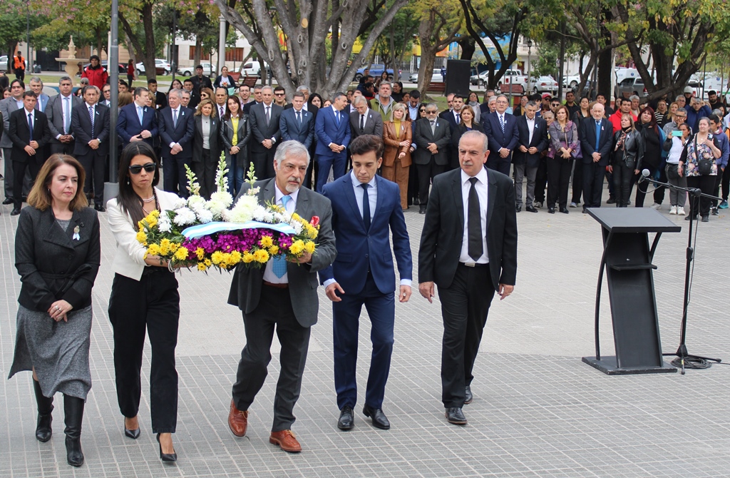 Luego, los representantes de los tres Poderes del Estado provincial, del municipio y Concejo Deliberante capitalinos, de fuerzas de seguridad y entidades intermedias, colocaron ofrendas florales al pie del monumento ecuestre del General San Martín, que se erige frente a la Casa de Gobierno.