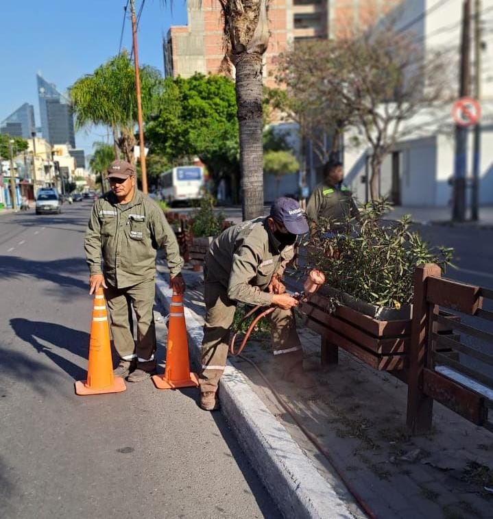 Personal de la Dirección de Parques y Paseos de la Municipalidad de la Capital trabajó en la renovación de la pintura de los canteros de la platabanda de Avenida Belgrano, en el tramo de Alsina a Rivadavia.
