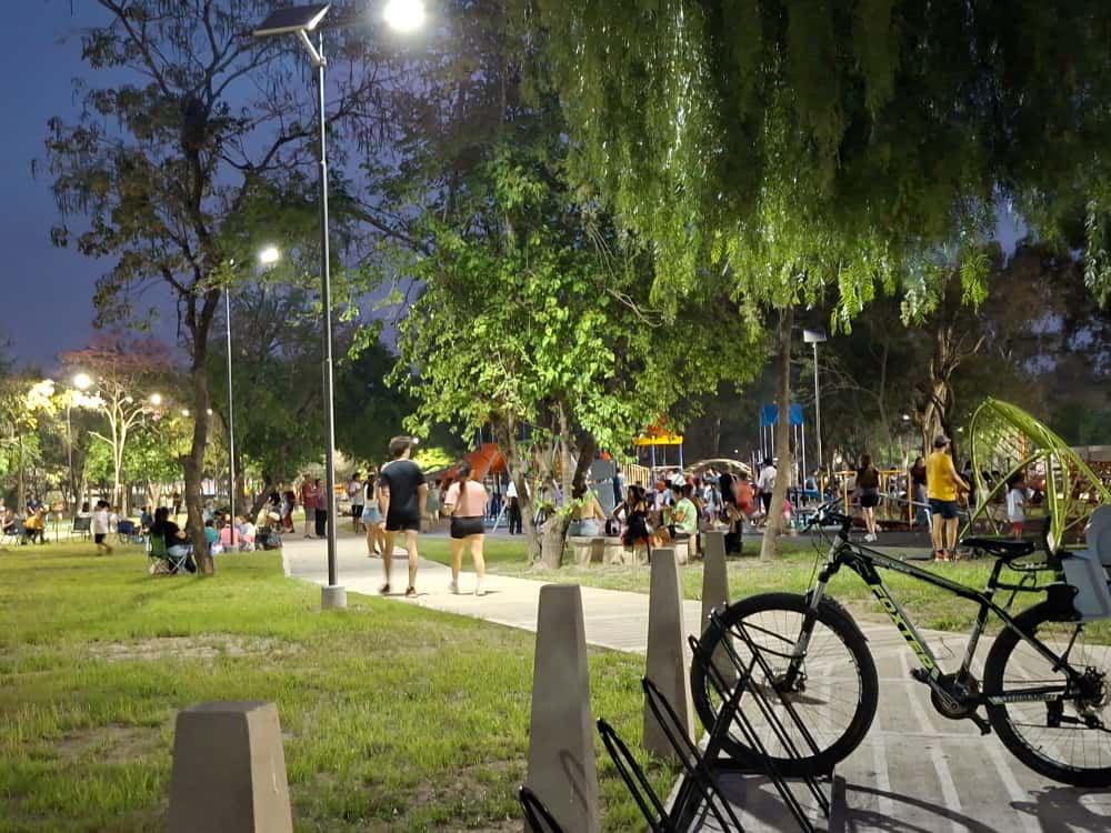 En todo el parque se respetó la arboleda original del lugar. También se instaló iluminación led eléctrica y solar, además de luces ornamentales.