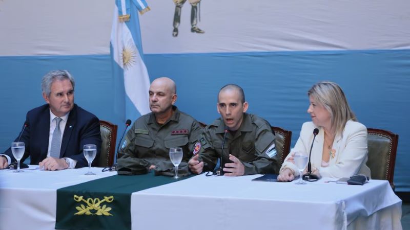 Sobre el final de la declaración a la prensa, sin preguntas habilitadas, el gendarme agradeció a las instituciones, organismos internacionales y al Estado. “No voy a dar nombres, solamente digo: a toda la Nación Argentina”, cerró. Lo antecedieron en la palabra el jefe de Gendarmería, Claudio Miguel Brilloni; el canciller, Pablo Quirno; y la ministra de Seguridad, Alejandra Monteoliva, que fue la encargada de abrir la conferencia.